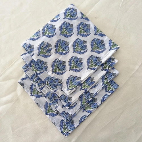 Blue, Green Floral Hand Block Printed Napkins | Sustainable Cotton Dining Set | Indian Hand Block Print